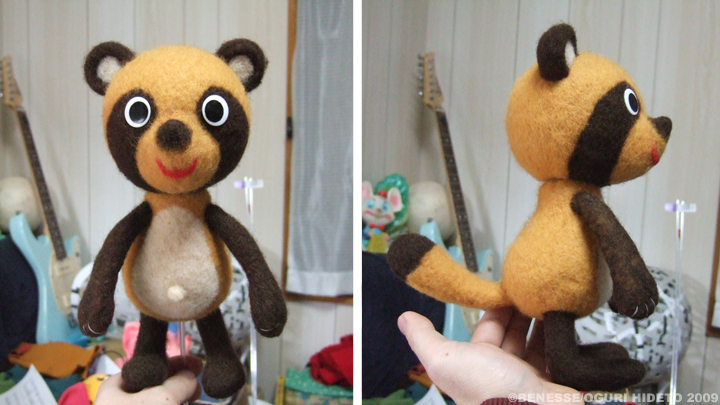 身長23cmほど、両手および首が上下左右に可動するたぬきの子です。フェルト植毛で、柔らかな印象です。目はアクリルのボタンです。童謡「げんこつやまのたぬきさん」で「ぽんぽこぽん」と踊る関係上、手は長めに作成してあります。部屋が乱雑なのは、制作作業時には仕方のないものです。制作作業時以外も乱雑ですが。